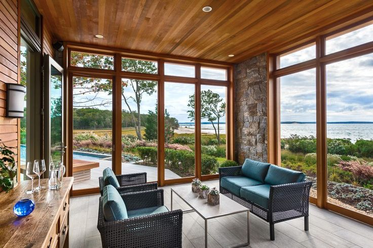 В деревянные рамы можно вставить стеклянное полотно или стеклопакет с воздушными камерами. Это дает возможность использовать конструкции из дерева для остекления террасы загородного дома. Панорамное остекление от пола до потолка убирает визуальные преграды между помещением и улицей, зрительно расширяет пространство. Остекление террасы позволяет создать зону отдыха на границе жилого пространства и открытого воздуха. Стекло служит защитой от внешних факторов и позволяет любоваться пейзажем или рукотворной красотой прилегающей территории. Если терраса рассчитана на отдых только в теплое время года, остекление можно сделать холодным. Для этого потребуется деревянный профиль минимальной толщины и ударопрочное стекло. Но более практичным решением станет теплое панорамное остекление террасы, которое круглый год будет обеспечивать комфортные условия в зоне отдыха. Самые ходовые виды древесины для светопрозрачных конструкций – это сосна, дуб и лиственница. Конструкции из дуба обойдутся слишком
