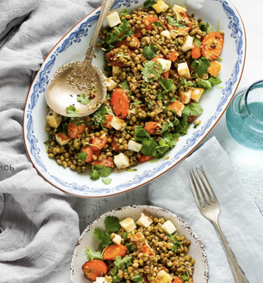 ✅Маш или проращиваем , или отвариваем. Предварительно нужно замочить его на несколько часов, а затем варить в большом количестве воды, пробуя периодически уже через 10 минут. Нарезаем морковь на брусочки, добавляем соль, мед и растительное масло, все перемешиваем. Запекаем в духовке до румяности. Откладываем в сторону, чтобы она немного остыла. Халуми обжариваем на сковороде на небольшом количестве масла в течение 1-2 минуток для румяного цвета и приятного аромата. Сыр нарезаем не тонко, чтобы он остался сочным внутри и поджаренным снаружи. Добавим немного соли. Огонь будет средним или выше среднего. Затем разрезаем халуми на кубики. Приготовленный маш заправляем яблочным уксусом и оливковым или заранее приготовленным ароматным маслом. Для этого нужно разогреть масло, добавить туда семена фенхеля, зиры и тмина, а через 1-2 минутки убрать сковородку с огня и добавить измельченный чеснок, а также хлопья чили. Чеснок на остаточном тепле начнет отдавать свой аромат маслу. Затем можно проц