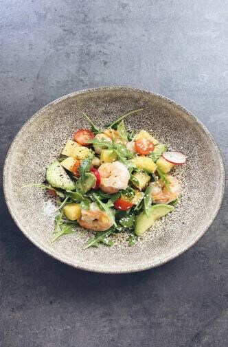 ✅Рукколу замачиваем в холодной воде на 20 минут. Креветки обжариваем на небольшом количестве кокосового масла, добавляем немного соли и перца чили. Для заправки интенсивно перемешиваем сок лайма с маслом, добавляем немного соли для вкуса. Главная фишка этого салата – спелый и сладкий ананас. Очищаем и нарезаем его кубиком, редис – тонкими кружочками, авокадо – слайсами, а черри – половинками. Немного посолим все овощи, чтобы они ярче раскрыли свой вкус. Ананас по желанию можно обжарить на сковороде гриль. Также можно взять консервированный ананас, но только без сахара в составе. Все ингредиенты соединяем в большой миске, заправляем и перемешиваем. Посыпаем кунжутом и подаем немедленно! ✍Ингредиенты: 8-10 тигровых креветок ¼ ананаса 2-3 редиски 1 авокадо горсть помидорок черри пучок рукколы кокосовое масло соль, чили перец кунжут ✍Для заправки: 1,5 ст.л. оливкового масла сок ¼ лайма соль