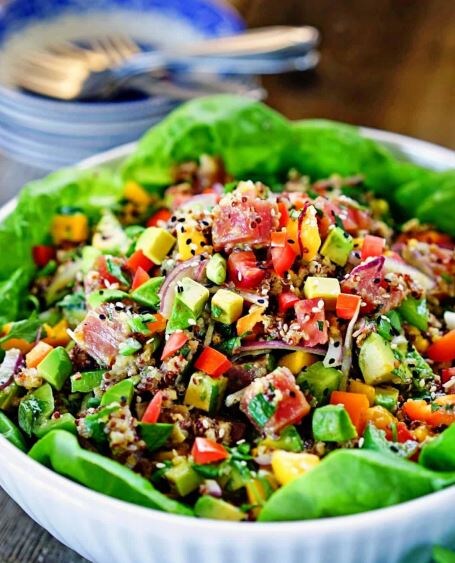 ✅Красный лук режем на тонкие ломтики, заливаем его уксусом, накрываем пищевой пленкой и оставляем мариноваться на 15 минут. Отвариваем киноа. Остужаем. Тунец режем на кубики и маринуем в соевом соусе, добавляем семена кунжута, немного кунжутного масла и рисового уксуса. К рыбе отправляем и пару ломтиков маринованного лука. Если такой традиционный японский способ подготовки сырого тунца вызывает у вас недоверие, тогда просто обжарьте его. Не забываем, что тунец должен быть ВЫСОКОГО качества. Готовим заправку: в маленькой миске взбиваем сок лайма, уксус, масло, мед, приправляем солью и перцем. Болгарский перец, манго и авокадо нарезаем мелким кубиком, кинзу и зеленый лук измельчаем и выкладываем все в глубокую тарелку. Туда же — охлажденную киноа. Украшаем веточками кинзы, посыпаем кунжутом. Приятного аппетита! ✍Ингредиенты: 1 красный лук 2-3 ст.л. винного уксуса 150 г тунца 1 ст.л. соевого соуса 1 ст.л. рисового уксуса ½ ч.л. семян кунжута 100 г микса киноа 1-2 болгарского перца зеленый