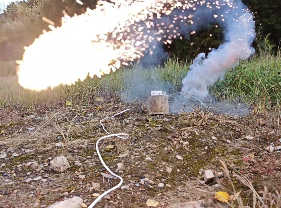 В своей первой статье я писал о том, что попытался купить огнепроводный шнур УС-200 и у меня это не вышло. Мне в голову пришла идея получше - купить непосредственно сами модули и протестировать их. На Авито были приобретены 2 модуля произведенных в июле 2018 года: Отсоединенный огнепроводный шнур УС-200 (самозапуск): При ближайшем рассмотрении мы видим трубку, надетую на пластиковый штуцер с резьбой, внутри которой проходит сам огнепроводный шнур: Подключается он к устройству запуска УЗО-2С и имеет общую с электроподжигом камеру сгорания: Откручиваем 6 болтов и аккуратно снимаем площадку вместе с узлом запуска: Вид со стороны сопла. При инициировании запуска одним из методов, из сопла вырывается форс пламени: Который поджигает газогенерирующую таблетку. Под действием газов создается давление, капсула с порошком раскрывается, выбрасывая огнетушащий порошок: Мне не удалось сходу выяснить из какого вещества состоит эта таблетка, поэтому условно назову его оксид бурания: Непосредственно с
