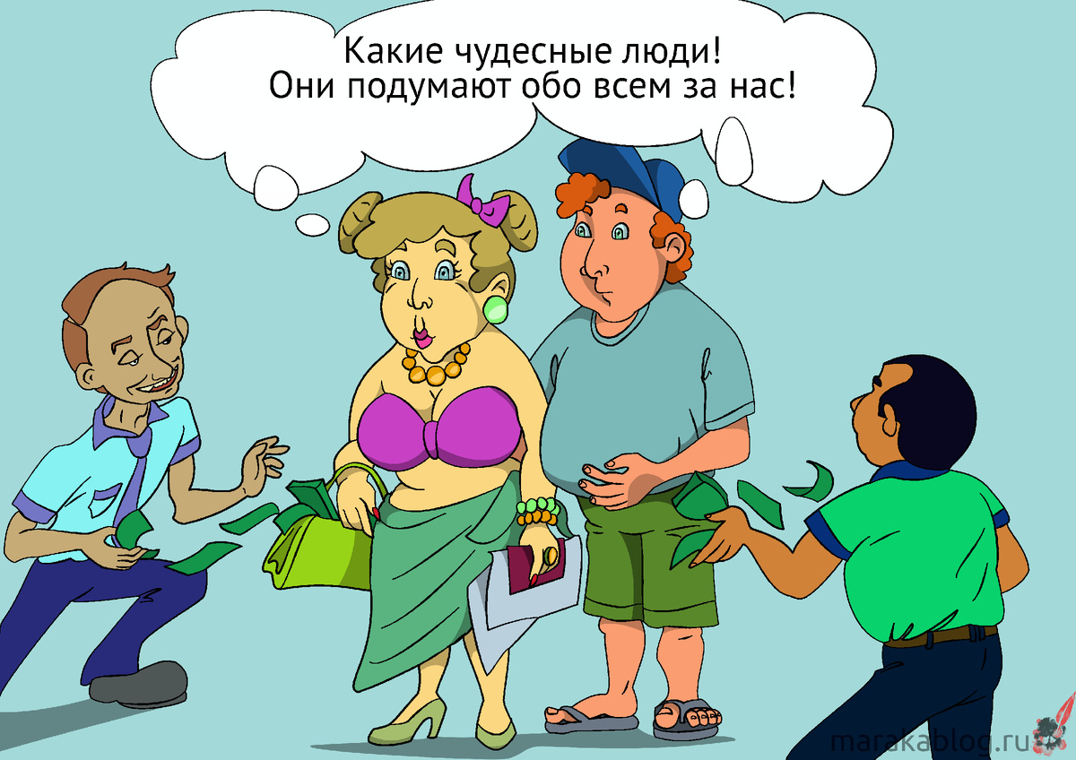 - массой таких же безмозглых блеющих отель с ол инклюзивом и чётким расписанием развлечений, хорошенько стригут твою отросшую за зиму шерстку карманы и кошельки и обработанных, отъевшихся на круглосуточном рационе, доставляют обратно на родные пастбища.