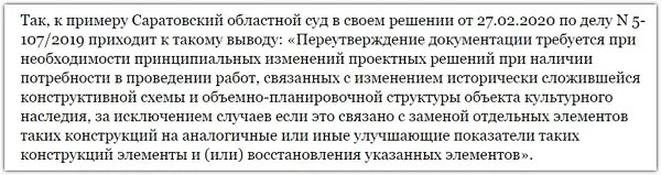 Второй подход прямо противоположен. Внесение правок в уже согласованный и прошедший экспертизу проект меняет документацию, т.е. она фактически становится новой. А раз ст. 45 Федерального закона «Об объектах культурного наследия» говорит о необходимости проводить ГИКЭ в отношении проекта работ по сохранению ОКН, а затем согласовывать его в органах госохраны, то кто мы такие, чтобы нарушать этот порядок?