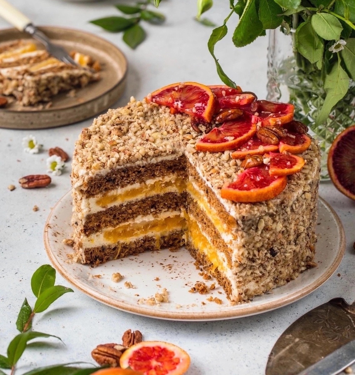 Рубрика: "рецепт дня" Предлагаю вам приготовить этот роскошный торт. ✅ Ингредиенты для коржа: - 160 г муки - 160 г натертой моркови - 100 г сахара - 75 г грецких орехов - 2 яйца - 40 г растительного масла без запаха - 35 г сливочного масла (комнатной температуры) - 10 г ванильного сахара - 1 ст. л. молотой корицы - 1 ч. л. соды - 10 г разрыхлителя - щепотка соли ✅ Ингредиенты для крема: - 300 г творожного сыра - 150 г сливочного масла (комнатной температуры) - 80 мл сливок (33%) - 70 г сахарной пудры - Ваниль по вкусу ✅ Ингредиенты для апельсинового конфи: - 300 г мякоти сочного апельсина (без пленок и косточек) - Цедра половины апельсина - 50 г сахара - 8 г пектина ✅ Приготовление: Корж: 1. Измельчите морковь с помощью блендера до мелкой крошки (можно также натереть на мелкой терке, но длинные волокна могут испортить текстуру). В другой миске взбейте яйца с сахаром и ванилью до пышности. Измельчите орехи и обжарьте их на сухой сковороде до золотистого цвета. Затем добавьте в яичн