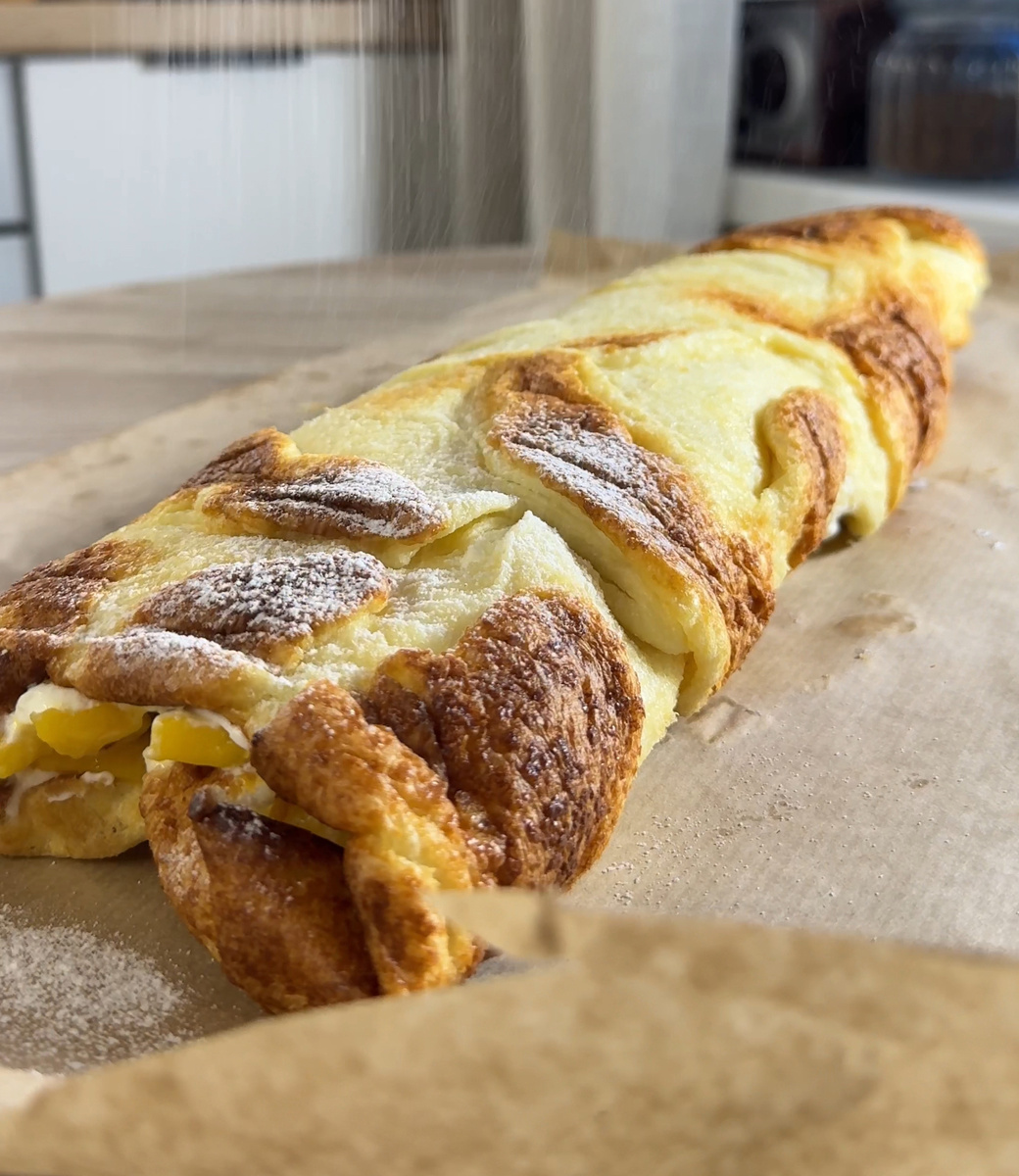 Блин с кремом и кусочками манго Данный рецепт - прекрасная альтернатива полюбившемуся нам меренговому рулету. Только у кого-то меренга может не получится с первого раза, а в этом рецепте все в разы проще, получится у каждого! Приготовление основы для нашего рулета ничем не отличает от приготовления теста для обычных и привычных нам блинчиков для жарки. Начинаем с яйиц, сахара, ванилина и щепотки соли, нам необходимо все соединить воедино и немного взбить венчиком до пены. Добавляем половину положенного количества молока и снова хорошо все перемешиваем до однородности. Далее идет мука, идеально будет просеять ее для пышности, снова перемешиваем и вливаем оставшееся молоко. Блинное тесто почти готово, осталось лишь добавить сливочное масло, которое нужно растопить в микроволновой печи или другим удобным для вас способом. Доводим тесто до однородности и даем отдохнуть 5-10 минут. А мы пока с вами подготовим большой противень. Застилаем его пергаментом, советуем брать пергамент сил