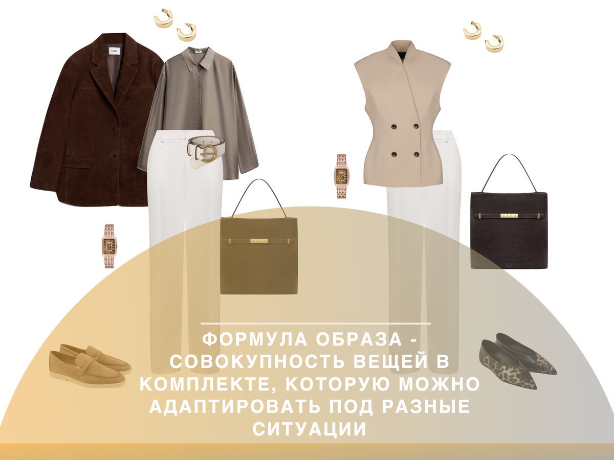Формула образа — это описание комплекта, то из чего он обычно состоит, Она обычно выглядит следующим образом: джинсы+футболка+жакет+кеды+сумка кросс боди. Формул образов у вас может быть несколько, для разных жизненных ролей. Их можно модифицировать, добавляя аксессуары или стилистические приемы. Но главное, чем необходимо обладать для формирования формулы образов - знаниями как правильно составлять комплект. Комплект — это коммуникация, через которую мы во внешний мир транслируем информацию о себе: Ваш образ — это всегда впечатление, чтобы вы не одели и куда бы ни пошли люди всегда будут смотреть на вас