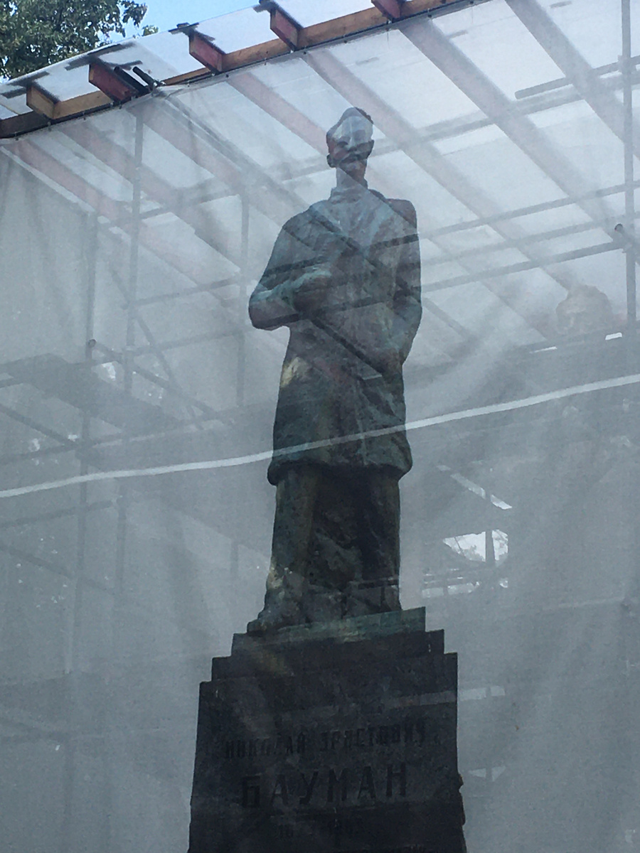 В нашем Басманном районе памятников не счесть. И Лермонтову на Красных воротах, и юному Пушкину на Бауманской улице, и Грибоедову на Чистых прудах, Николаю Гавриловичу Чернышевскому, неоднозначной фигуре в русской истории, хотя в школе его из программы убрали, и правильно, писатель он был плохой, хотя в свое время и модный. На Чистопрудном бульваре есть даже памятник Абаю Кунанбаеву, одному из первых казахских поэтов (аккурат напротив посольства Казахстана). А чуть дальше, на том же бульваре — памятник нашему великому Грибоедову. Советским драматургам — Вампилову, Володину и Розову — поставили во дворе «Табакерки», только попасть туда могут лишь зрители тетара. На Китай-городе стоят Кирилл и Мефодий, создатели русской письменности. Есть бюст Петра в Лефортовском парке, бюст Екатерины II, даже два Ленина сохранились — один молодой в Огородной Слободе у дома пионеров, бывшего особняка чаеторговца Высоцкого, и голова в во дворике на улице Лукьянова (бывший Бабушкинский переулок). А в 1-м