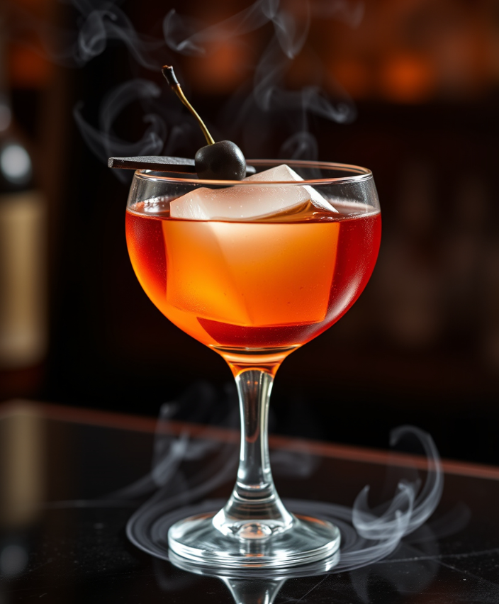 Этот коктейль сочетает в себе насыщенный аромат бурбона с мягкими нотками хереса и вермута, дополненный дымным оттенком, создавая уникальный послевкусие и атмосферу расслабленности после долгого дня.