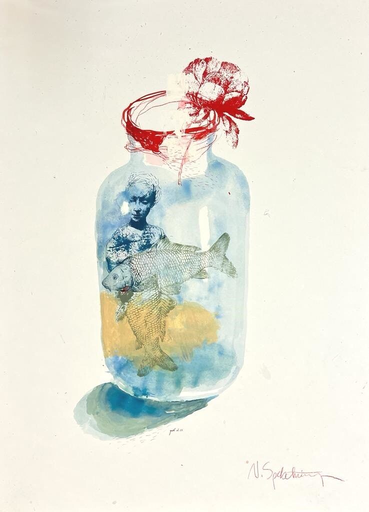 «Рыба для кошки или Улов №…» В графической серии Наталии Спечинской «Рыба для кошки или Улов №…» собраны самые разные артефакты: от классических образцов искусства до редких или курьёзных вещей. Кузнечики, стрекозы, русалки или старинные статуэтки наполняют хрупкие оболочки банок и бутылок, словно витрины антропологического музея. Наблюдая за повседневными занятиями людей и помещая их «под стекло», Наталия Спечинская рассматривает их как феномены времени. Внимательно исследуя эти необычные сочетания вещей, художница производит рефлексию над символическим содержанием стеклянных аквариумов. Заигрывая с нашим воображением, она погружает зрителя в эфемерный мир фантазий, где обретают плотность хрупкие материи идей. Увидеть графику Наталии Спечинкой можно в нашей галерее. По всем вопросам обращайтесь в личные сообщения.