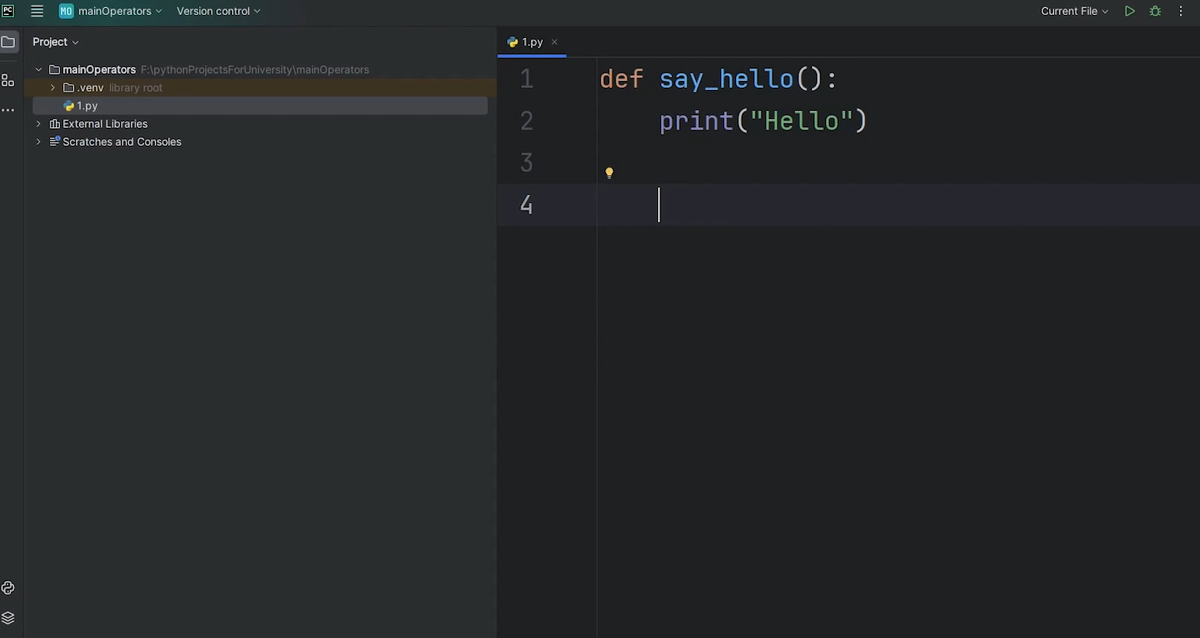 Допустим, у нас функция, которая будет говорить «привет», поэтому мы назовем ее «say_hello». После ключевого слова пишем название функции и обязательно пишем круглые скобки, а затем двоеточие (Рис.1). Следующая строчка кода с отступом в четыре пробела будет относиться именно к этой функции. Пусть в этой строчке у нас будет «print(“Hello”)».