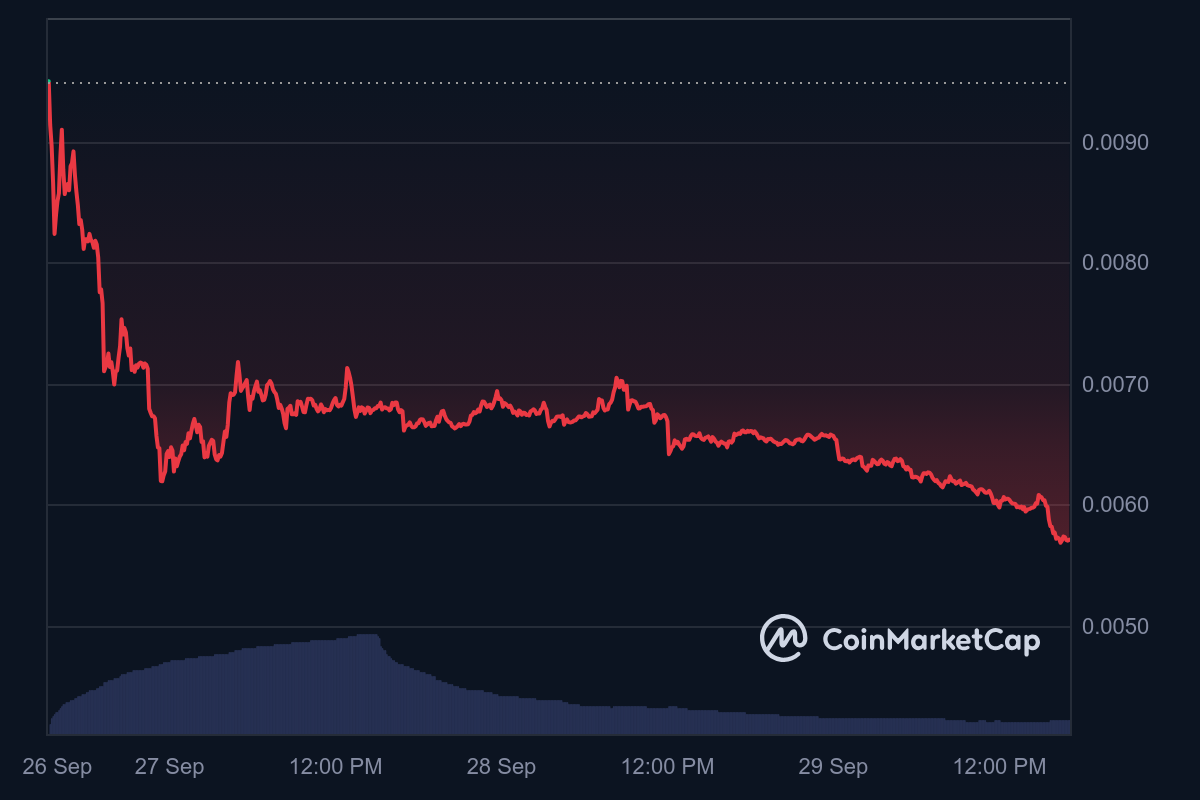 На Binance к моменту публикации заметки монета торговалась на отметке $0,0056. Максимум в рамках суток — $0,0065. Минимум — $0,0055.