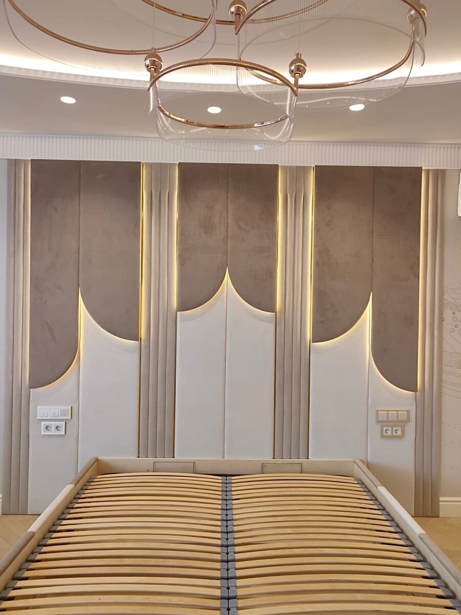 ДИЗАЙНЕРСКИЕ МЯГКИЕ ПАНЕЛИ в спальне создают атмосферу уюта и элегантности. Светлые оттенки, такие как бежевый, кремовый или пастельные тона, визуально расширяют пространство и делают его более светлым. Латунные золотые вставки добавляют роскоши и изысканности, а подсветка подчеркивает текстуру панелей и создает мягкое, располагающее освещение. Такое оформление создаст стильную и уютную атмосферу в спальне🤍 Выбрать цвет и посмотреть образцы изделий можно у нас в Шоу-Руме по адресу: г. Москва, ул. Бутырская д. 5 тел. 8 499 346 66 29+ WhatsApp