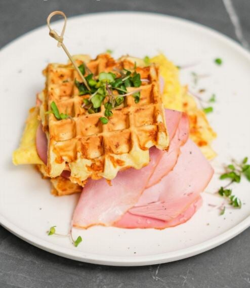✅Два вида сыра натереть на мелкой терке. Остальные ингредиенты для вафель соединить вместе с помощью миксера, блендера или вилки. Добавить к готовому тесту два вида сыра и перемешать до однородности. Разогреть вафельницу, смазать маслом панели, выложить тесто таким образом, чтобы оно заполнило практически весь периметр секции тонким слоем. Закрыть вафельницу и жарить на средней мощности до румянца. В моей вафельнице это заняло около 7 минут, но вполне возможно, время нужно будет отрегулировать индивидуально под ваше оборудование, а также предпочтения: сделать более мягкие или более хрустящие вафли. Для подачи сделать омлет с сыром: разболтать яйца с помощью вилки до однородности, смазать хорошо разогретую сковороду маслом, вылить яйца, подождать пока схватятся, выложить сыр и подержать еще пару минут на небольшом огне до полной готовности. Свернуть омлет, разрезать на 2 части. Подать вафлю как сэндвич: вафля, омлет, слайсы ветчины, вафля. По желанию можно добавлять дополнительно соус,