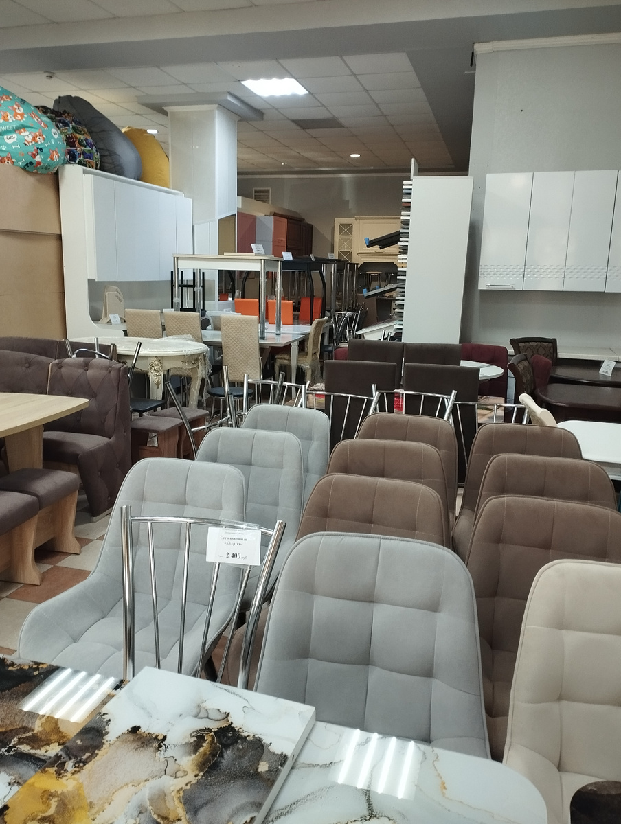 Наметилось логичное продолжение неожиданной даже для нас, жителей этого города, темы строительства нового жилья в Донецке, вопрос о котором вчера был почти решен: Впрочем, равно как и благоустройства старого, но уже имеющего. В этой связи вопрос, если вы решили купить мебель, куда поедете? Конечно, в мебельный салон или даже гипермаркет. У нас в Донецке все они закрылись в 2014, спешно распродав остатки со складов и выставочных залов. Позже открылись вот такие. В небольших торговых помещениях образцы выставлены так плотно, что с трудом удаётся протиснуться в лабиринте проходов. Здесь меня поражают цены на мягкую мебель. Диван за 103 тысячи рублей - это серьёзный удар по семейному бюджету. Кстати, мягкую мебель у нас в Донецке успешно производит крупная местная фабрика, которая устраивает акции и даёт скидки. Но большинство потенциальных покупателей всё-таки идёт в подобные салоны, не желая пользоваться интернетом. Да, диван и матрас здесь можно увидеть и пощупать. А вот с корпусно