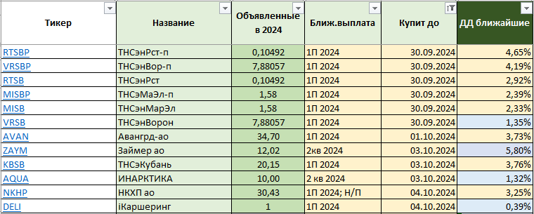 Эти акции принесут вам доход уже в следующем месяце. Но стоит ли в этом участвовать? Об этом в конце мое мнение. Последний день для покупки акций под дивиденды и див. доходности. 30.09.2024 ТНС энерго Ростов-на-Дону: $RTSB 2,92% и $RTSBP 4,65% ТНС энерго Воронеж: $VRSB 1,35% и $VRSBP 4,19% ТНС энерго Марий Эл: $MISB 2,33% и $MISBP 2,39% 01.10.2024 Авангард: $AVAN 3,73% 03.10.2024 Займер: $ZAYM 5,8% ТНС энерго Кубань: $KBSB 3,76% Инарктика: $AQUA 1,32% 04.10.2024 НКХП: $NKHP 3,25% Делимобиль: $DELI 0,39% С ТНС-ками никогда не связывался, особо ничем не выделялись. Есть тут, кто в теме? Думаю, углубиться в эту нишу. Есть выживающие, есть дорогие, но пару акций взял на заметку, ТНС Кубань, например. Но это исключительно первичный взгляд, нужно копаться. Если кому-то интересно, напишите в комментариях. Авангард - обходим стороной. Крайне не рекомендую эту акцию. Не вижу в компании ни одного плюса. Но как наглядный пример, отличный кейс. Если видите такую динамику прибыли, капитала, рен