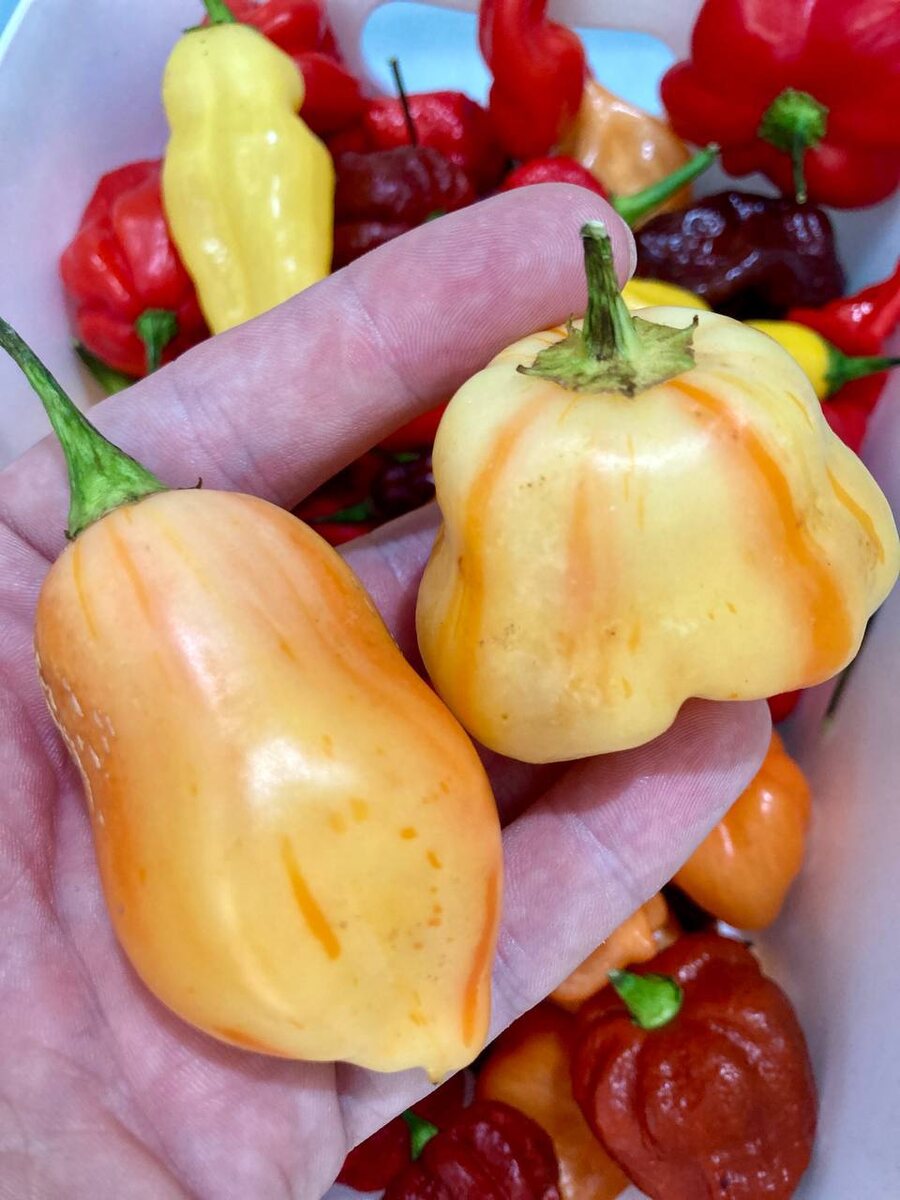 Близкий родственник к прошлому публикуемому сорту Aji Fantasy Apricot — чили Stripey тоже относится к виду Capsicum baccatum, известный своим отчетливым полосатым внешним видом и умеренной остротой. Этот сорт — прекрасная мутация популярного перца чили Aji Fantasy, ценимого как за яркие цвета, так и за насыщенный фруктовый вкус. Внешний вид: самой отличительной чертой перца чили Aji Fantasy Stripey является его полосатый или мраморный внешний вид. Стручки имеют полосы желтого, красного, оранжевого и иногда зеленого цвета, что создает потрясающий визуальный эффект. По мере созревания стручков эти полосы становятся более выраженными. Перцы обычно маленьких или средних размеров, округлой, колокольчатой или НЛО-образной формы. Обычно они вырастают примерно до 3-6 см в длину. Вкус: данный сорт известен своим сладким, фруктово-цитрусовым вкусом, как и другие сорта Aji Fantasy. Вкус часто описывается как тропический, с оттенками цитрусовых и легкой сладостью. Перец действительно очень сочны