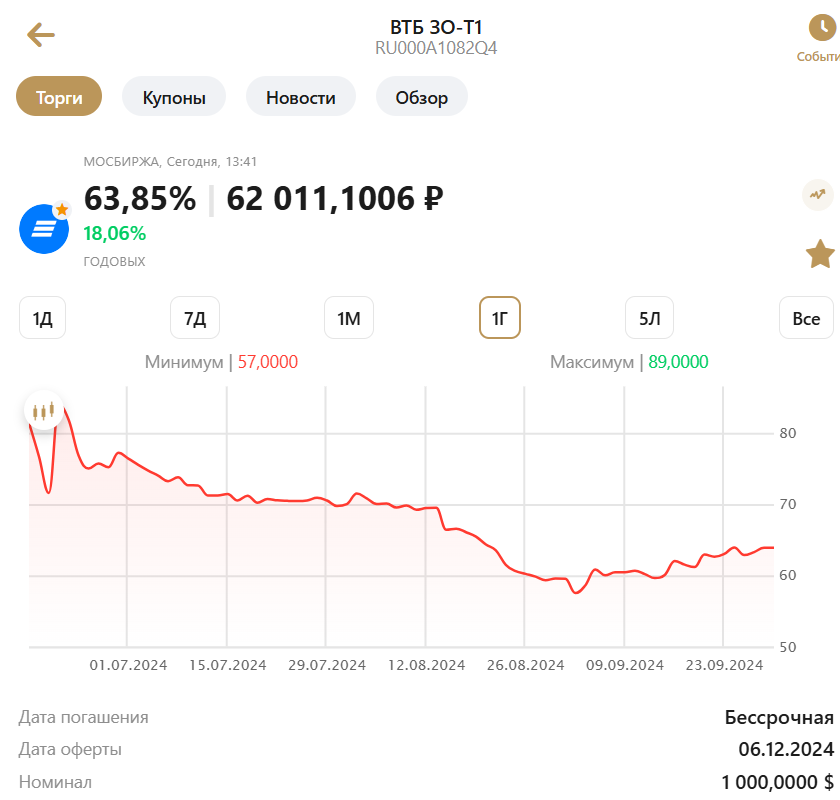 Похоже, что дно цены в замещающих облигациях ВТБ ЗО-Т1 RU000A1082Q4, о котором я писал в начале сентября