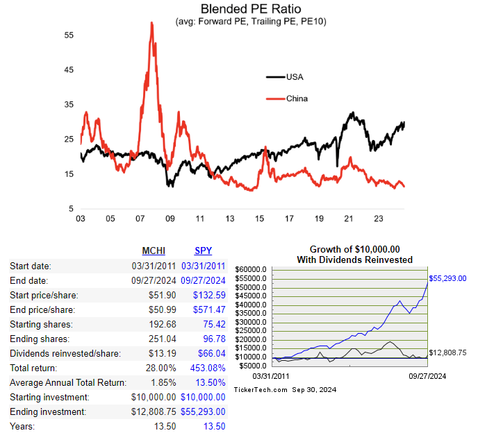 Китай или США? Вверху два графика P/E (Цена/Прибыль) - стоимостного коэффициента, обозначающего "дороговизну" фондового рынка. Мы можем видеть, что по США он близок к 30, а в Китае - около 10. Казалось бы, решение, что покупать - очевидно. Дешевый китайский рынок! Тем более, что Партия Китая пообещала денежные стимулы, а сам Китай - вторая экономика мира. Но вот цифры инвестора говорят об обратном. 🔸При всем росте китайской экономики... 🔸При всей дешевизне китайского рынка... 🔸При всех перспективах Китая в мире... Инвесторы почти ничего не заработали! Стимулы? Ну да, стимулы - но в тоталитарном Китае стимулы точно так же и забрать могут. Как забрали рынки (а значит и деньги) у китайских IT-компаний вроде Alibaba и Tencent. P.S. Это, кстати, не означает, что нужно скупать именно широкий американский рынок на всю котлету. Все же P/E действительно высок. Но вот покопаться, выбирая первоклассные акции, точно стоит. И цены будут адекватные, и рост в 14-16% (а в перспективе ближайших лет