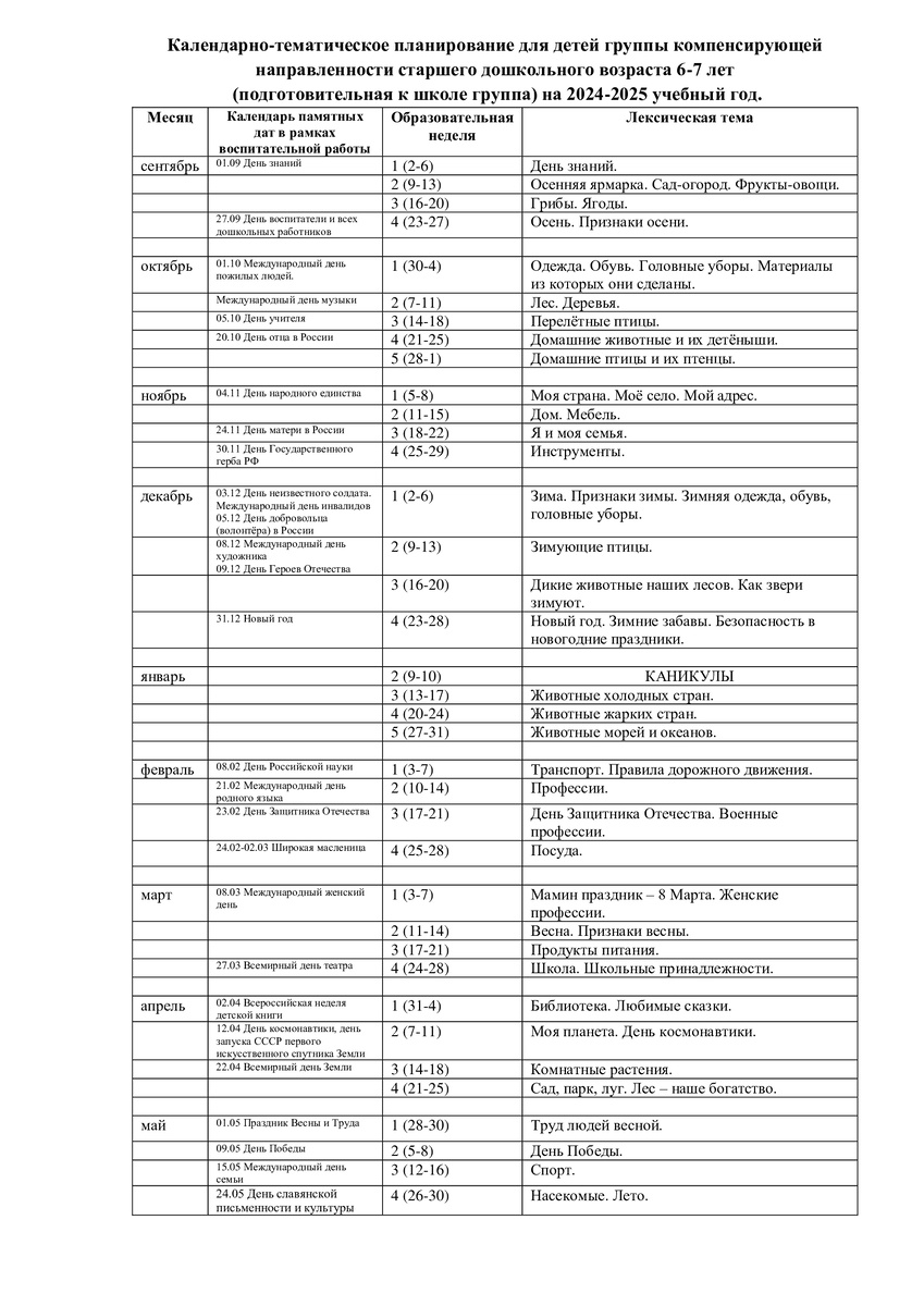 Календарно-тематическое планирование для детей подготовительной группы компенсирующей направленности