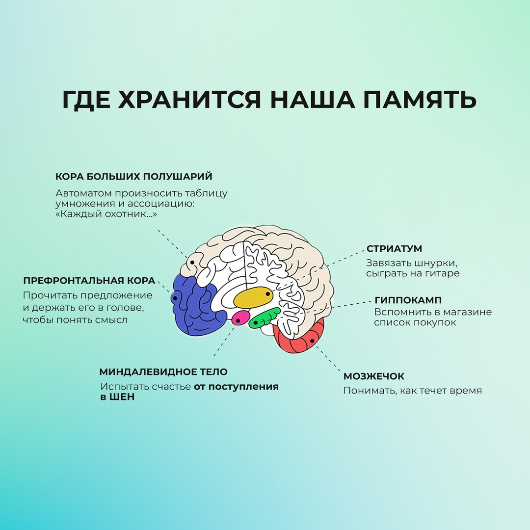 Мозг — сверхмощный компьютер, которому нужна правильная «прошивка». Давайте разбираться. Первый этап — загрузка. На нем новая информация попадаем в кеш — кратковременную память. Второй этап — сохранение. Когда мы повторяем информацию, она перемещается на жесткий диск — в долговременную память. Мозг разделен на отсеки, в каждом из них хранится отдельная информация. Смотри в карточке, что за что отвечает. Советы или как прокачать свой мозг: — чаще повторяешь — прочнее закрепляется; — чтобы лучше запомнить, визуализируй, подбирай ассоциации или записывай; — дай мозгу перезагрузиться.