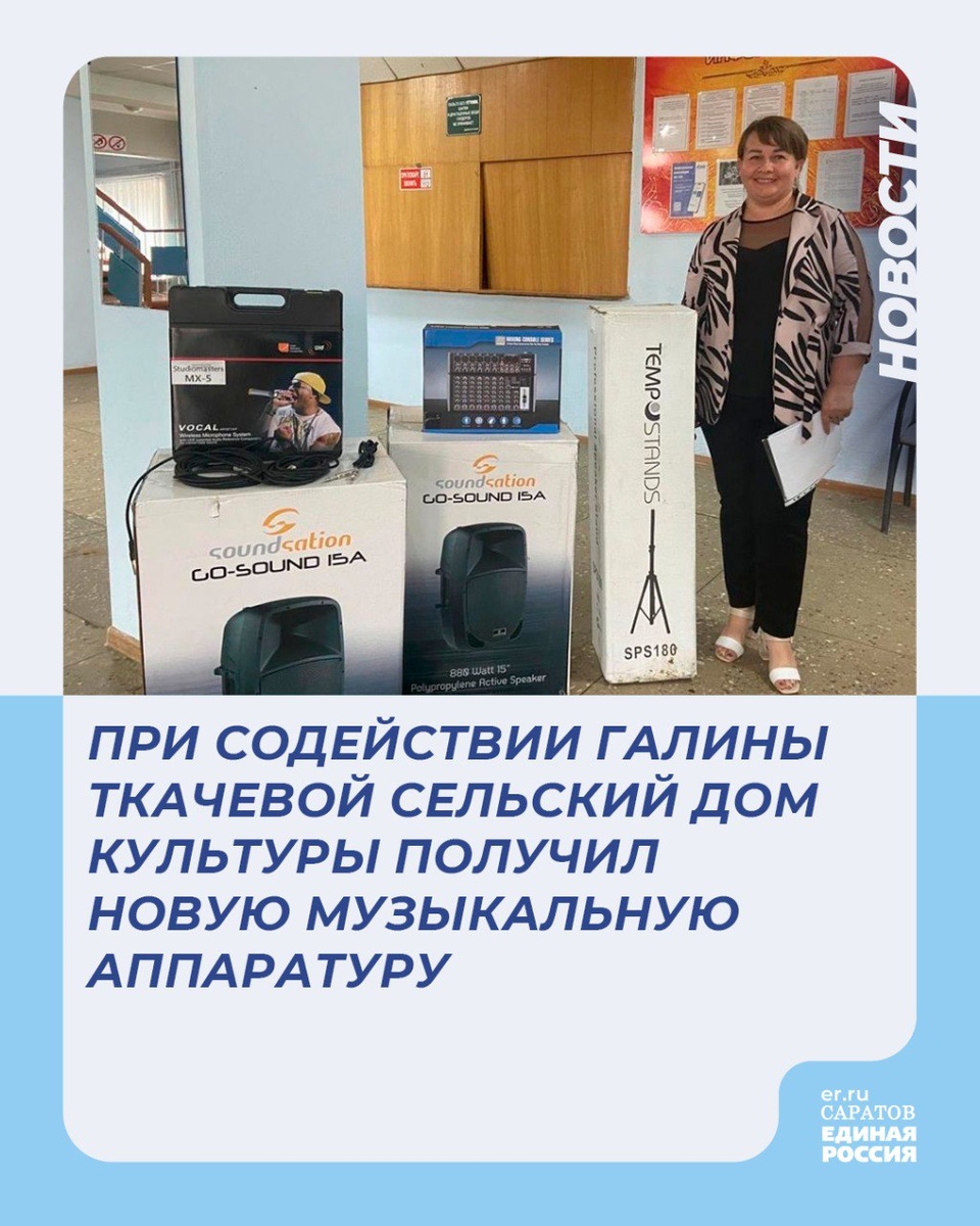 🗣️К депутату областной Думы Галине Ткачевой обратилось руководство Дома культуры села Усатово Краснокутского района с просьбой оказать содействие в приобретении музыкального оборудования, необходимого для проведения различных мероприятий на базе учреждения. Данное обращение не осталось без внимания, благодаря помощи парламентария клуб получил обновлённую акустическую систему, микшер и микрофоны. 🎵 Оборудование не только улучшило звучание, но и повысило уровень проведения мероприятий в Доме культуры. Теперь в клубе можно проводить концерты, дискотеки, театральные постановки, а также различные конкурсы и фестивали, что делает культурную жизнь села более насыщенной и привлекательной. «Помощь учреждениям социальной сферы – это не просто выполнение депутатских обязанностей, а важный вклад в создание комфортной и достойной жизни для всех жителей. Жизнь в сёлах должна быть более интересной и яркой, создавая условия для творческого развития и отдыха, важно, чтобы каждый житель, независимо