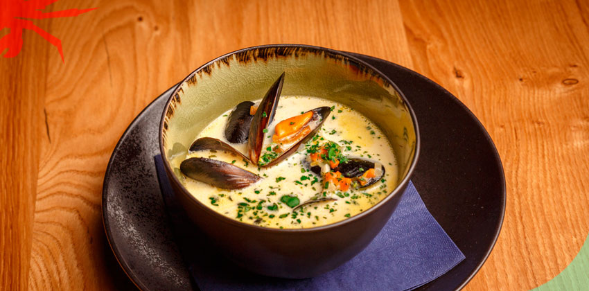 Вливаем тёплые молоко со сливками и жидкость от варки мидий. Доводим до кипения и оставляем на небольшом огне примерно на 15 минут. Снимаем суп с огня и взбиваем погружным блендером. Возвращаем на огонь, смешиваем с мидиями без раковин и варим ещё минуту-две. Подаем с рубленой зеленью и мидиями.
