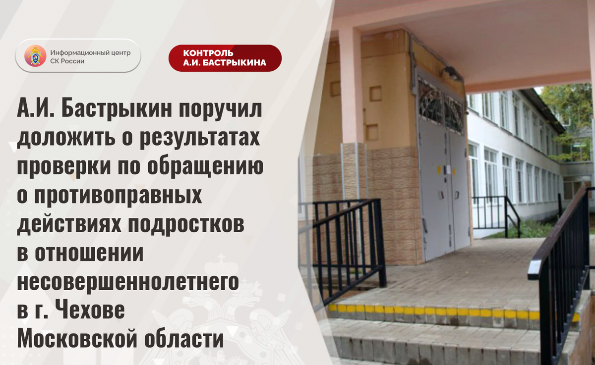 К Председателю СК России А.И. Бастрыкину в его приёмную «ВКонтакте» обратилась жительница Московской области. Она сообщила, что после перевода ее 14-летнего брата в образовательное учреждение в городе Чехове одноклассники систематически совершают в отношении него противоправные действия, а также высказывают угрозы в адрес его семьи. Обращения к руководству школы результатов не принесли.