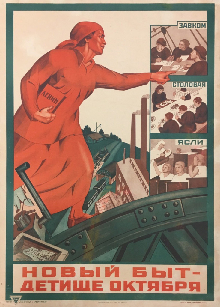 Из этого следовало специализированное строительство и перепланировка зданий с местами общего пользования. Ванна, туалет и кухня одна на этаж, а не в каждой комнате. Появилось понятие «коллективизация бытового обслуживания», подразумевалось устройство бань, прачечных, столовых, чайных, кухонь, а еще яслей и детских садов.