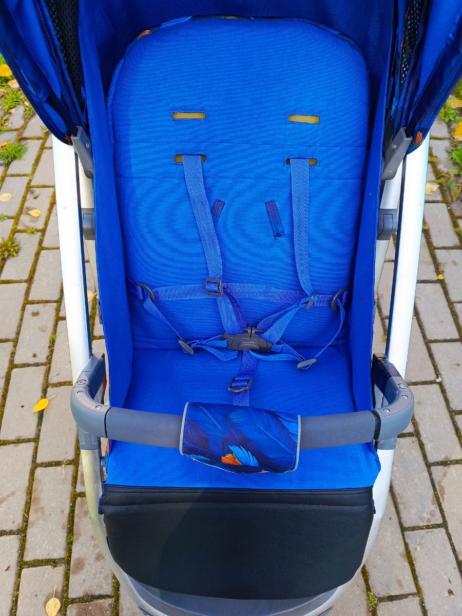 Я сначала хотела сделать сиденье из кожзама, чтобы точно не пачкалась, но есть одно но: пользуемся мы коляской активно летом, а сидеть в шортах на кожзаме должно быть некомфортно. Поэтому сделала я чехол из ткани duck и только низ, там где обувь, из кожзама.