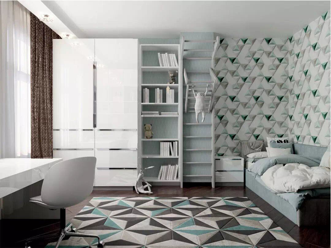 У дальней стены установлен двухсекционный шкаф для одежды с парой распашных дверец и шестью выдвижными ящиками. Рядом находится открытый стеллаж с семью полками. У его боковины располагается шведская лестница с угловым турником. Зона сна и отдыха размещена в углу помещения. Здесь стена отделана панелями с 3D-эффектом, создаваемым треугольниками разных цветов. Подобный рисунок имеет ковер, постеленный на полу.