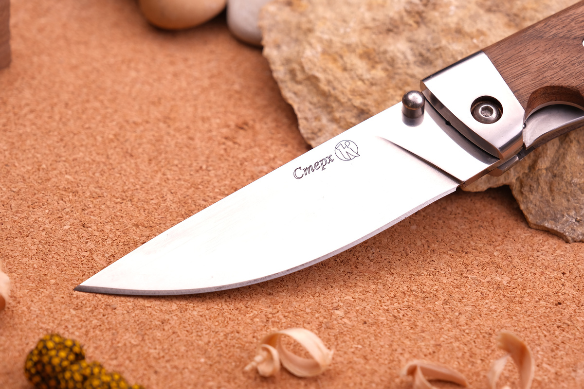 Нож складной Стерх стальная притина Клиновая заточка в основном предназначена для лучшего проникновения внутрь разрезаемого материала, но также выдерживает высокие нагрузки при ударах, и нагрузки «на излом». Сталь АUS-8 твёрдость 57-59 HRC, японская нержавеющая сталь золотая середина среди всех ножевых сталей, хорошо держит заточку, сталь легко поддаётся заточке даже подручными средствами, хорошие показатели ударных нагрузок. При не высокой цене, это отличный выбор как профессионалов, так и любителей. Рукоять дерево - кавказский орех, уникальность текстуры и богатство цветовых оттенков являются отличительной чертой кавказского ореха.