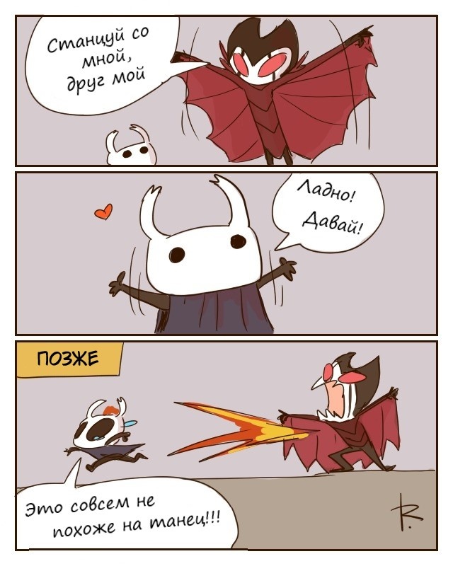 Люблю Hollow Knight. Лучшая метроидвания и одна из лучших игр, в которые я когда-либо играла. Мне нравится, как она сочетает тлен и безысходность с милой мультяшной графикой. Авторы комиксов чаще обращают внимание на его милую сторону - я встречала сравнительно мало комиксов, вспоминающих о грустных сторонах игры. Так или иначе в мою новую подборку переводов попали комиксы, которые мне показались смешными. Всегда было немного жаль сражаться с Гриммом. Жиза. В каждой локации первым делом бежишь искать картографа Корнифера. Технически это не комикс, а мем. Но я с него кекнула, а значит он достоин быть в этой подборке) Момент, когда отдых на скамейке телепортировал героя в другую локация был действительно неожиданным, и геймеры часто его мемят Отсылка на известный мем с девушкой и неграми. Этот я не стала переводить, потому что git gud (старайся лучше) - фраза мем, которая даже в русские геймерские сообщества проникла без перевода. Её обычно связывают с Соулсами и жалобами на их сложност