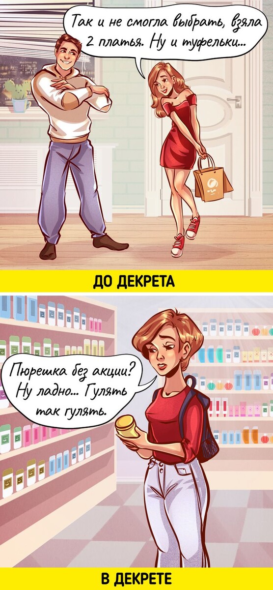 Привет-привет! Если вы когда-либо пытались найти пульт под горой игрушек или уговаривали ребёнка не прятаться в самых очевидных местах, то этот комикс точно для вас! Сегодня я расскажу о родительских буднях. Так что присаживайтесь поудобнее, смотрите до конца и не забывайте ставить лайк, если узнаете себя в этих ситуациях! До декрета — шопинг: это целая церемония, когда выбираешь наряд с мыслями: "Как же я буду выглядеть?" А потом — бац! — в декрете вместо крутых платьев ты стоишь перед полками с подгузниками. Всё! Шикарные наряды остались в прошлом, теперь главное — комфорт и удобство. Реальность родительства буквально переворачивает твои приоритеты. Как тут не улыбнуться? До детей ты думаешь, что знаешь, что такое бардак, но потом появляются дети — и вот, мир перестает существовать без игрушек на полу и исчезающих предметов. Даже банальный поиск пульта может стать целой миссией. Когда ты слышишь от кого-то "просто занимайся тем, что хотят дети", так и хочется ответить: "Легче сказа