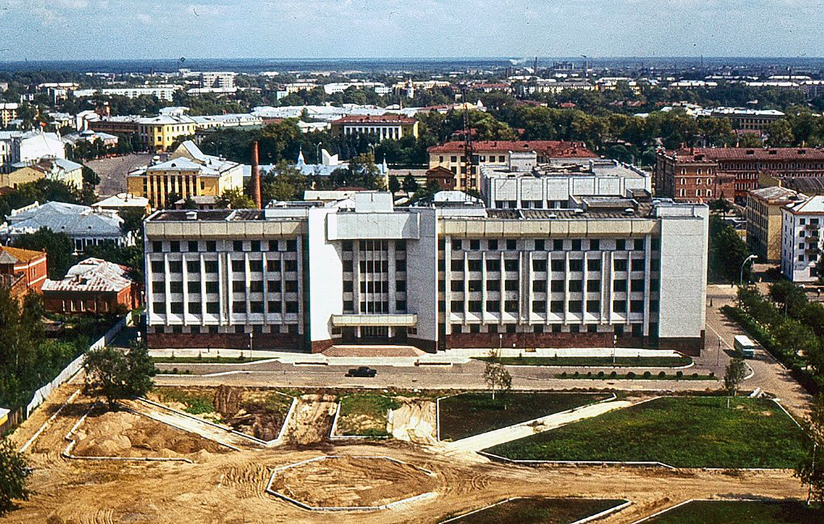 На снимке конца 1980-х идёт формирование площади, которая 15 лет будет оставаться безымянной. В 2004 году она получит название в честь первого секретаря Вологодского обкома КПСС Анатолия Семеновича Дрыгина и это событие будет приурочено к его 90-летию. Сам Дрыгин скончался ещё в 1990-м, так что про этот факт не узнал. На месте площади исторически была деревянная застройка и в принципе довольно интересный квартал сам по себе.