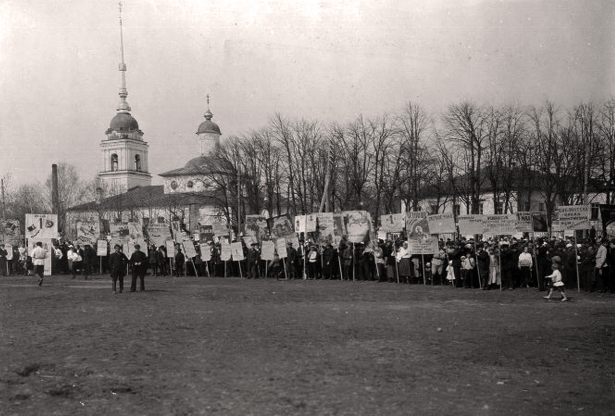 На первом снимке 1 мая 1925 года и демонстранты с транспарантами собрались на Советской площади. Давайте разбираться, где же это. Советская площадь до 1918 года была Парадной, а сейчас это место занимает Кировский сквер. Здесь же проходила в те времена и улица Советская, которая исторически называлась Кирилловской, а с 1956 года и пой сей день известна нам как улица Ленина. Важный объект для понимания места - церковь на заднем плане. Это Кирилло-Иоанно-Богословская церковь, построенная к 1653 году, но перестроенная заново к 1900 году из-за ветхости. Думаю, что по названию церкви понятно, откуда пошло историческое название Кирилловской улицы. Теперь сориентируем церковь на местности и в этом нам поможет второй снимок начала 20 века. Там слева видно трёхэтажное здание, которое упоминалось в предыдущих постах. Да, именно в этом доме располагалась в советские годы та самая "Блинная" на улице Ленина. Как раз напротив здания бывшего кинотеатра "Салют". Сейчас, увы, от этих историч