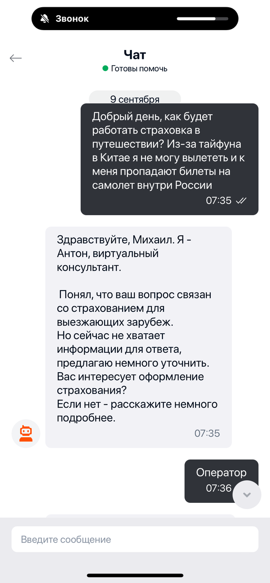 Сразу же в день моего предполагаемого вылета их Хайкоу в Москву, 9 сентября, когда стало ясно, что вылет задерживается из-за последствий тайфуна и я точно не успеваю на свой рейс из Москвы в Пензу, пишу в чате Росбанка