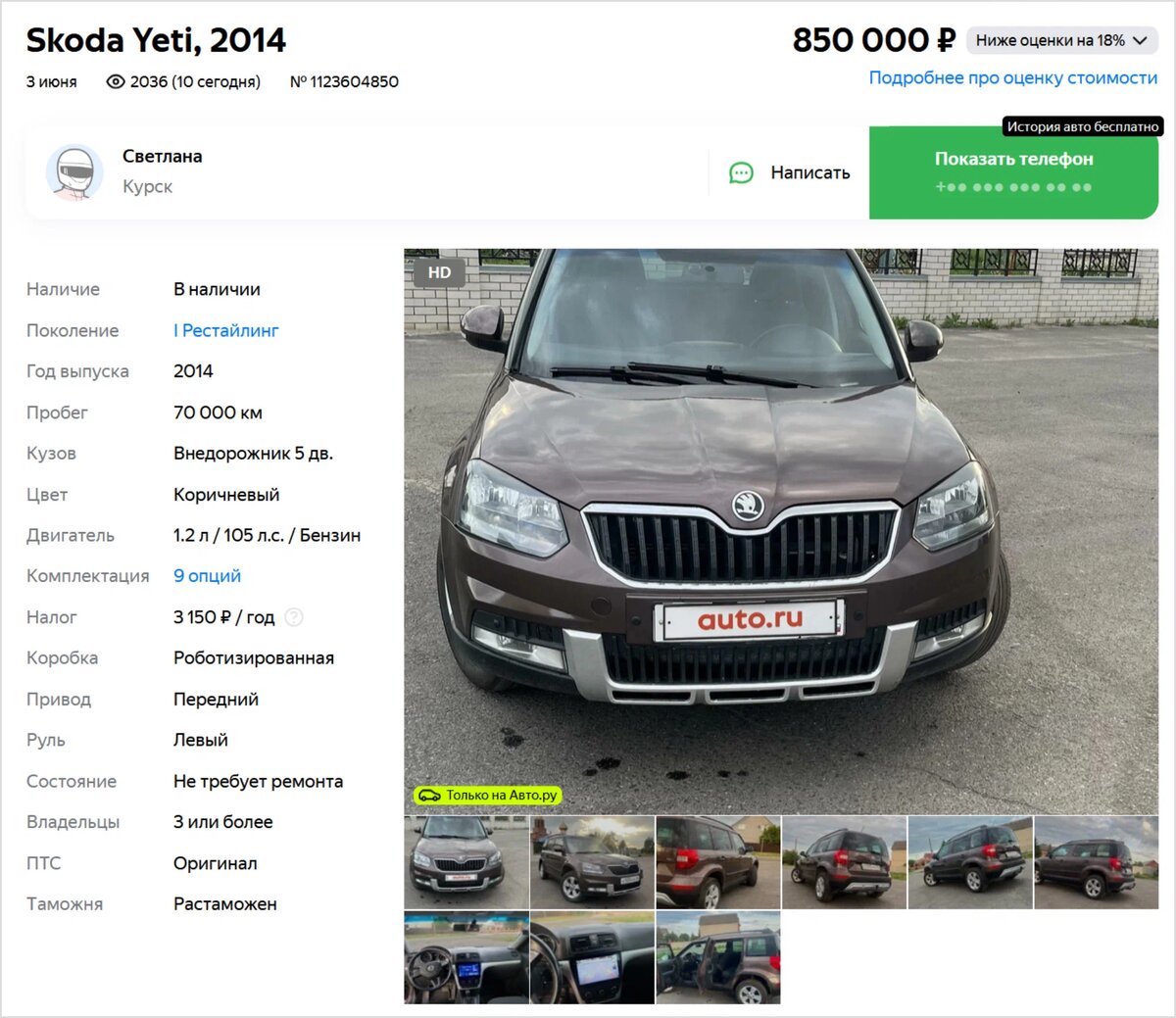 В рубрике «Не бит, не крашен» уже были объявления, в которых продавцы прямо указывали на некоторые недостатки своих машин. Но каждый раз выяснялось, что рассказывали они далеко не всё. Сегодня — ещё один такой случай. В Курске продают Skoda Yeti 2014 года выпуска. У компактного кроссовера довольно скромный для своих лет пробег — 70 тысяч километров. А хотят за него 850 тысяч рублей, что недорого на фоне рынка. На фотографиях — неплохо сохранившийся автомобиль, пусть и с некоторыми следами эксплуатации. А в описании говорится о хорошем состоянии, уместности торга и крашеных элементах кузова. Автомобиль в хорошем состоянии. Высокий, комфортный, большой багажник. Коробка не пинается, переключается без пинков. Масло поменяно. Масло не ест. Есть магнитола андроид, камера заднего хода, видеорегистратор. Есть крашенные детали. Звоните! Торг уместен! Однако ремонт в случае с 10-летней машиной — это нормально. Куда интереснее выяснить причину, по которой он всё-таки понадобился. Открываем Отчё