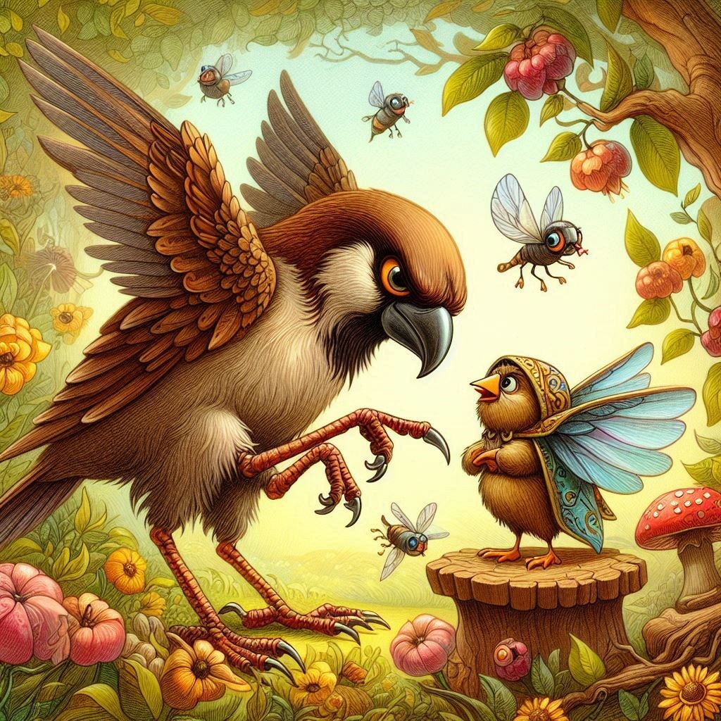 Жил-был воробей по имени Воробушек. Был он птицей смышлёной да трудолюбивой: каждый день летал по полям и лесам, собирал себе еду и строил гнёздышко. Но была у него одна беда — никак не мог он избавиться от назойливой мухи, что постоянно жужжала у него над ухом и мешала работать. Однажды, когда Воробушек уселся в своём гнезде отдохнуть, прилетела та самая муха и начала своё жужжание: — Ж-ж-ж, Воробей, что ты всё работаешь да работаешь? Летай, как я, весело, без забот! Чего тебе всё строить да искать? — жужжала она, кружа вокруг него. — Ох, Муха, дай мне покоя! — вздохнул Воробушек. — У меня и так много дел: дом надо закончить, еду собрать на зиму. Некогда мне летать без дела. Но муха не унималась и всё кружила рядом, надоедая своим жужжанием: — Ж-ж-ж, а зачем тебе трудиться? Еда сама по себе найдётся, дом можно и потом достроить. Летай, веселись, как я! Воробей терпел, терпел, да не выдержал и сказал: — Послушай, Муха, а покажи-ка мне, как ты живёшь, раз уж ты такая весёлая и беззаботн