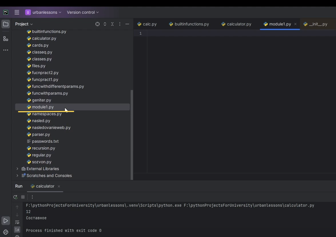 В принципе модулем можно назвать любой файл Python , который содержит код. Например, сейчас открыта папка с учебными проектами, и здесь есть файл «module1.py» (Рис.1). Любой другой файл с расширением «.py» здесь можно назвать модулем.