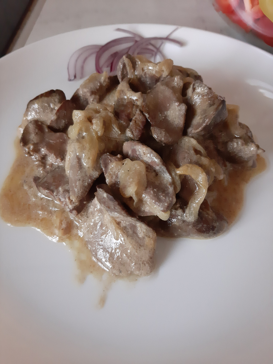 Нежнейшая, мягкая, ароматная, сочная куриная печень, тушеная в сметанном соусе.. Превосходный выбор к ужину! 1. Печень куриная - 1 кг, 2. Лук - 4-5 шт, 3. Сметана - 100 гр, 4. Соль, перец, 5. По желанию: крахмал - 1-2 чайн. ложки (кукурузный или картофельный). Время приготовления: 40 мин. 1. Подготовим продукты. Очистим лук. 2. Вымоем куриную печень, удалим пленки. 3. Лук порежем вдоль, так его форма лучше сохранится при жарке. 4. Порежем печень на большие кусочки. 5. Сначала обжарим лук на сковороде. 6. Затем к луку добавим печень и жарим 5 минут. 7. Посолим, поперчим и обжарим еще 15 минут. 8. Добавим сметану. Хорошо перемешаем. (На данном этапе можно добавить крахмал для густоты. Крахмал нужно предварительно растворить в небольшом количестве воды (1 - 2 столовых ложки воды на 1 -2 чайных ложки крахмала) так не будет комочков). 9. Накроем крышкой и будем тушить еще 20 минут. 10. После приготовления открыть крышку и дать постоять 5 минут. 11. Блюдо готово! 12. Можно украсить. Прият