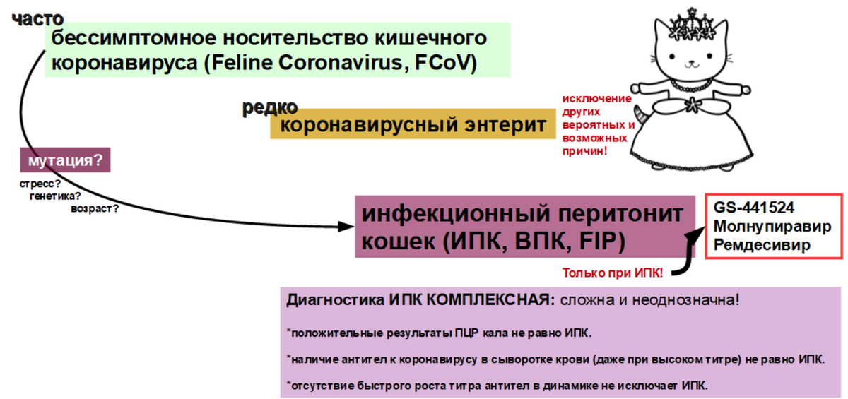 Анализы кала и крови на "инфекционный перитонит" (это в целом неверное название исследования, которое до сих пор позволяют себе использовать некоторые лаборатории!); анализы на коронавирус по сыворотке крови (ИФА) и калу (ПЦР), - всё это, к сожалению, не помогает диагностировать ИПК, так как не делает отличий между носительством коронавируса, эпизодами столкновения с "короной" в прошлом и самим ИПК.