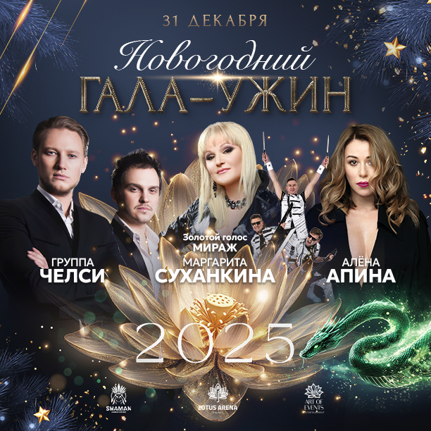 31 декабря на Lotus Arena пройдет новогодний гала-ужин. Гости услышат выступление группы Мираж (Маргарита Суханкина), Алены Апиной и группы Челси. Участников вечера ждет великолепная шоу-программа и гала-ужин с изысканным меню от шеф-повара ресторана SHAMAN, а также лотерея с розыгрышем ценных призов. Конечно же, в эту Новогоднюю ночь гостей поздравят Дед Мороз и Снегурочка, и само собой, центром притяжения внимания будет восьмиметровая елка. Волшебная атмосфера любимого праздника на тропическом острове гарантирована! Присоединяйтесь к нам, чтобы провести новогоднюю ночь в кругу друзей и близких, насладиться потрясающей шоу-программой и подпевать песни любимых артистов. Гала-ужин будет проходить на новой современной концертной площадке «Лотус арена» в районе Банг Тао . Эта площадка специально спроектирована для проведения масштабных музыкальных и спортивных событий. Площадка оснащена современным оборудованием, удобными ВИП ложами, зоной фудкорта, удобной зоной входа и парковкой на 400