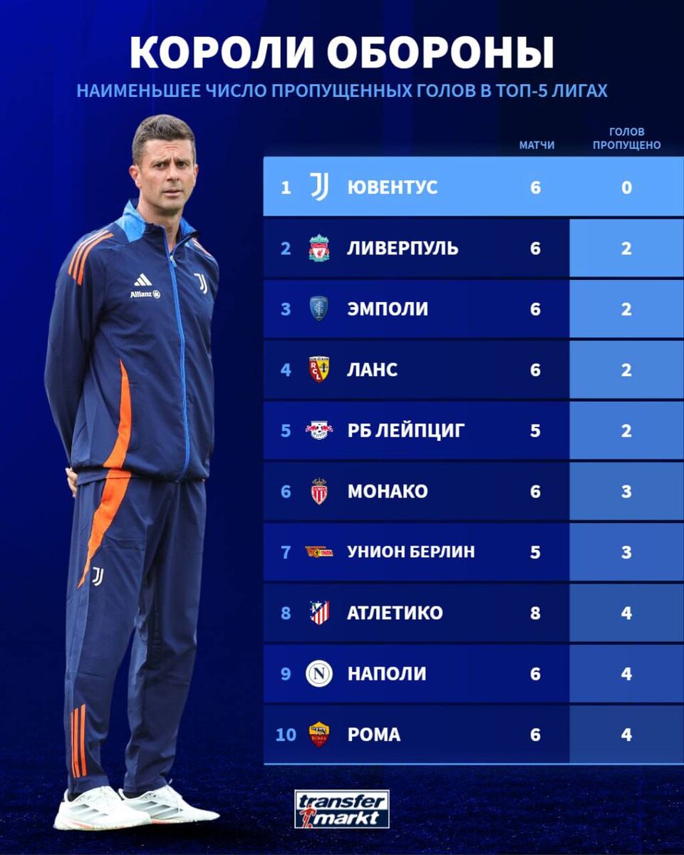 📊Команды, пропустившие меньше всех голов в топ-5 лигах.