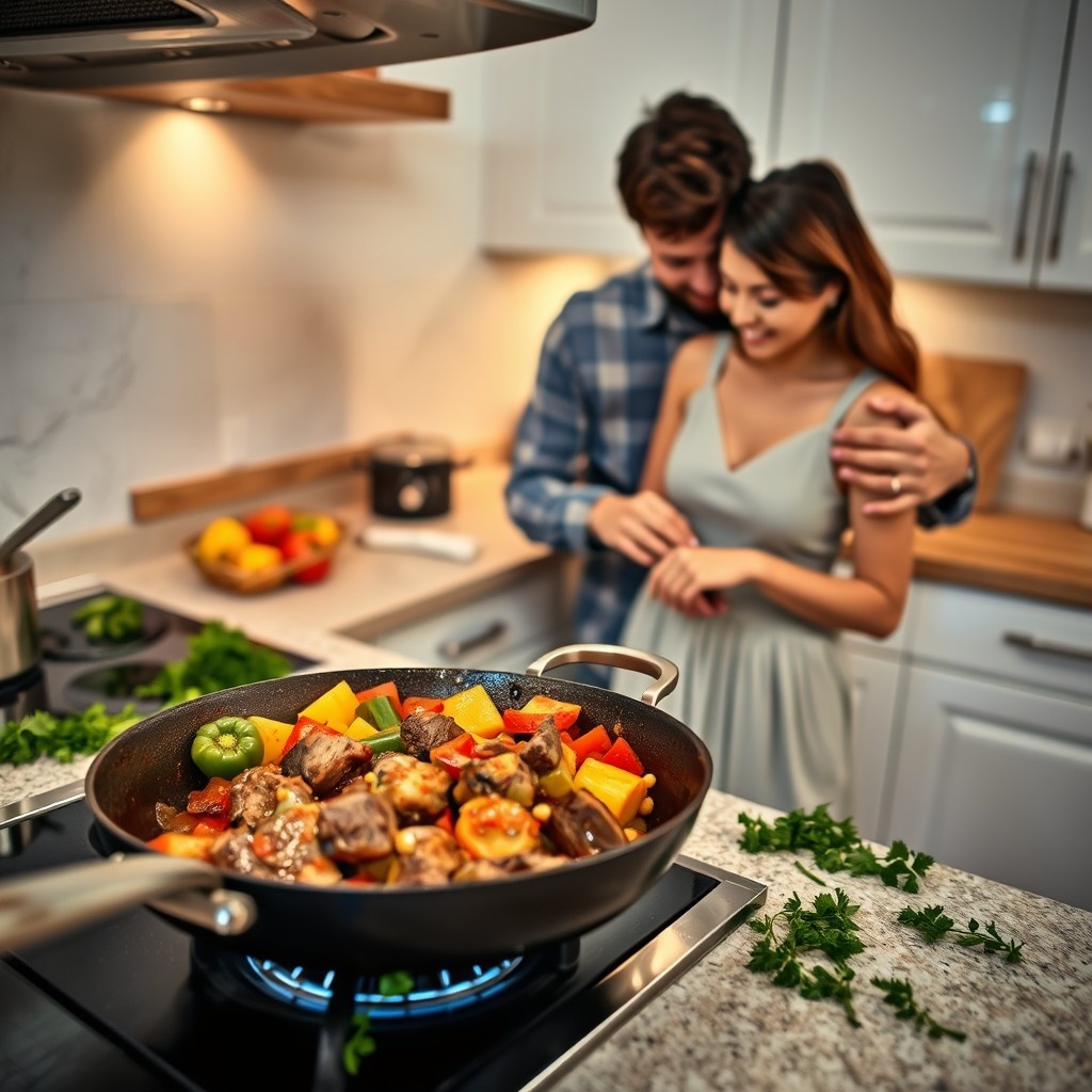 Этот вечер был особенным. После долгого рабочего дня мы вернулись домой и, не говоря лишних слов, отправились на кухню готовить ужин. Сегодня мы решили сделать что-то вкусное и простое — говядину с овощами в томатном соусе. Я достал из холодильника кусок говядины — 400 граммов, свежую зелень и овощи, а ты с улыбкой начала помогать. 🥰🍅 Ты взяла нож и начала аккуратно нарезать две головки чеснока тонкими ломтиками. Чеснок с каждым твоим движением наполнял воздух пряным ароматом. В это время я нарезал луковицу мелкими кубиками, стараясь не расплакаться. 😂 Мы смеялись, когда я отложил нож в сторону, чтобы протереть глаза, а ты заботливо бросила первые кусочки лука и чеснока на разогретую сковороду с оливковым маслом. 🌶️🔥 Пока лук и чеснок обжаривались на среднем огне около 3-4 минут, ты занялась мясом. Ты ловко нарезала 400 граммов говядины на ровные кусочки, и каждый из них напоминал мне, как аккуратна ты в любом деле. Я добавил немного соли и перца на мясо, и мы отправили его на ско
