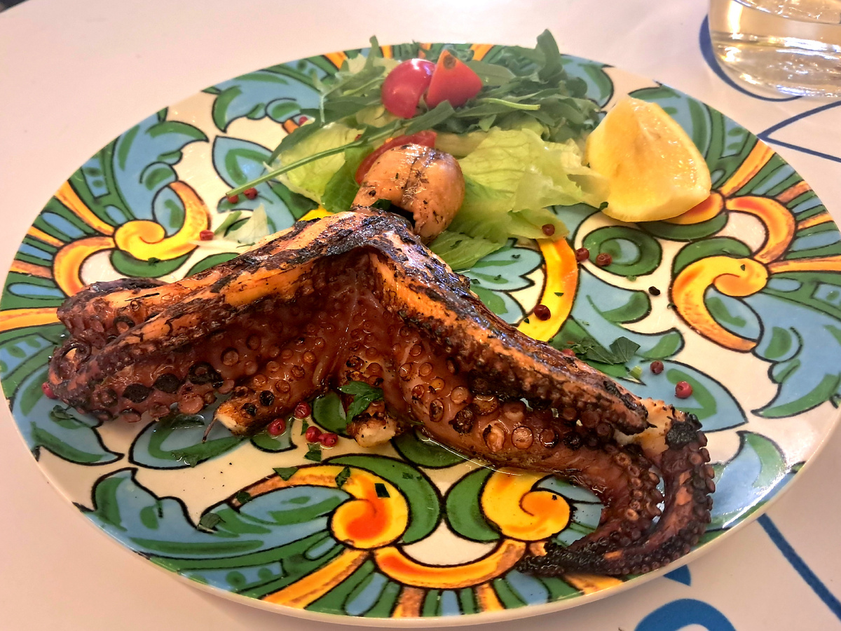 Конечно, это классика. Просто и лаконично. Где-то подают маленьких осьминогов, по штучке на порцию, где-то разделяют на щупальца. Дальше, как я понимаю, всё зависит целиком и полностью от мастерства повара: пару раз нам попадался жестковатый осьминог и достаточно резиновый, где-то был замечательно вкусно приготовленный. Ну тут никакой экзотики, конечно, осьминога на гриле практически везде (в приморских краях) подают: и в Турции я им наслаждалась, и в Греции, и в Португалии...