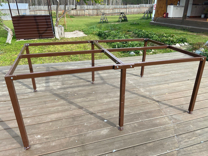 Собран из профильной трубы, где ножки 40*40*2, остальное 40*20*1, 5. Так же понадобилось: - Полоса металлическая 40*4 - Болты, гайки и шайбы М8 - Шайбы самые широкие что нашел - 6 штук - Гайки М14 - Шпилька М14 - Лист ФСФ 3000*1500*18 Каркас стола получился очень устойчивый, я даже отказался от укрепления ножек поперечными ребрами. Основные элементы дальше на фото, варил первый раз полуавтоматом, сейчас ручной даже в руки брать не хочу.