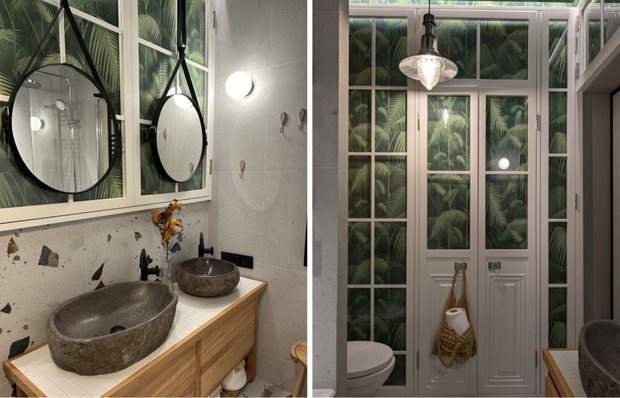 Оригинальные и красивые дизайн-решения для вашего вдохновения Дизайнер Анастасия Струве оформила яркий запоминающийся интерьер в двушке для молодой пары. Вдохновением послужила... советская оранжерея. Отделка совмещенного санузла максимально приближена к атмосфере ботанического сада. Он получился стильным и функциональным — обстановка здесь способствует умиротворению и расслаблению. Для отделки пола и части стен использовали модную плитку терраццо. Она выигрышно смотрится в небольшом помещении и помогает выделить несколько зон. Потолок в глубоком зеленом оттенке поддерживает выбранную стилистику, добавляет глубины и объема. Часть стен оформили моющимися обоями с растительным принтом и оригинальной конструкцией, имитирующей двери в оранжерею, — такой дизайн выглядит эффектно и необычно. Все створки открываются и позволяют провести полноценную уборку. Конструкция оснащена закарнизной подсветкой, которая создает красивую и уютную атмосферу. Площадь санузла позволила разместить полноценную