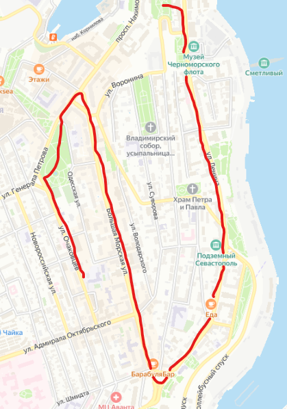 Приглашаю погулять со мной по центру города: улице Очаковцев, Большой Морской и Ленина. Будет много интересного и необычного. Ну что, пойдем прогуляемся? В прошлой статье мы с вами гуляли по вечернему Приморскому бульвару и заглянули на Матросский бульвар. И захотелось мне пройти по центральному кольцу города. Да, его я уже показывала и не один раз, но каждый раз можно находить что-то новое и интересное. Не верите? Дочитайте тогда статью до конца. Вот карта и мой маршрут: Начала я с улицы Очаковцев. Ни разу почему-то еще не показывала вам этот рисунок: Забавная женщина встречает нас у входа в "Оранжерею": Зимой компанию ей составлял пряничный человечек. Нравится мне, что указывают старые названия улиц: Подходим к Комсомольскому скверу: Фонтан этот всем знаком: Сквер я показывала подробно раньше, если кому-то интересно, то оставлю ссылку в конце. Повторяться и показывать одно и тоже не хочу. Девичий виноград: Роза: А дальше я дошла до площади Лазарева и свернула на Большую Морскую. З