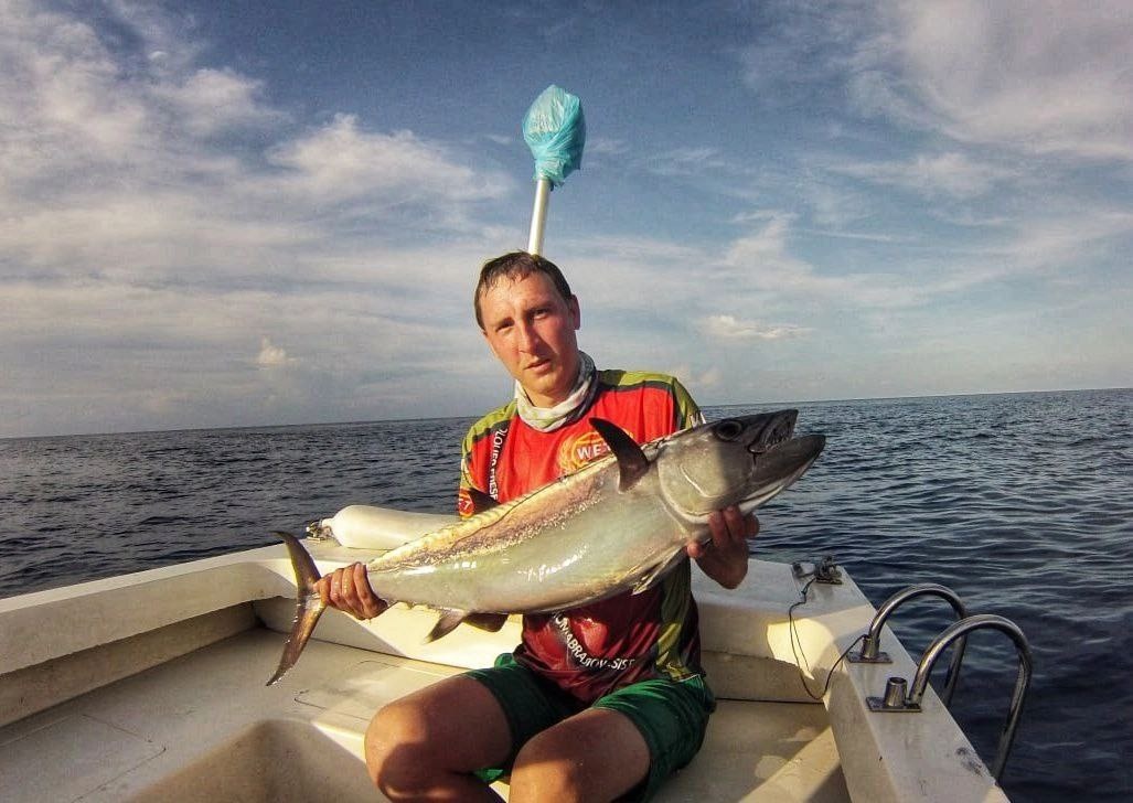 Собакозубый тунец, он же одноцветная гимносарда (Gymnosarda unicolor), Dogtooth Tuna или как его часто ласково называют рыболовы «Doggy». Doggy – этого тунца, так прозвали за его неукротимый нрав и за то, во что он превращает любую приманку после атаки. Благодаря огромному количеству конических зубов в пасти: на нижней челюсти до 24, на верхней до 31. Поклёвка резкая злая с уходом на максимальную глубину, порой даже топовая катушка с максимально затянутым фрикционом 30+ кг не способна остановить этого злодея. Приманка обычно после одной-двух поклёвок собакозубого сразу приходит в негодность. Поводки и шнуры срезает не хуже барракуды. По телосложению, напоминает ближайших родственников - пеламид. Относится к виду лучепёрых, семейства скумбриевых, единственный представитель рода гимносард. Считается одним из доминирующих хищников в регионе, наряду с акулами и каранксами. Способен развивать скорость до 80 км/ч. Может охотиться, как в одиночку, так и в стае. Питается кальмарами и пелагич