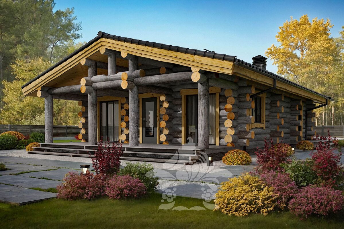 Баня из бревна в стиле Кело под практичной двухскатной крышей. В бане предусмотрена комната отдыха 26 кв.м. со вторым светом и увеличенной площадью остекления. Русская парилка на дровах с топочным помещением, моечная, предбанник, санузел и тёплый тамбур. У бани 2 входа с противоположных сторон сруба + открытая терраса 21 кв.м.